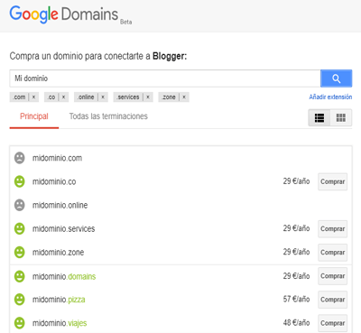 Maintenant, Google vous demandera si vous souhaitez connecter votre propre nom de domaine pour pouvoir le connecter à votre nouveau blog. Vous pouvez sauter cette étape ou cliquer sur » Rechercher » pour en regarder un, cela fait référence au fait que nous pouvons avoir notre propre domaine sans la terminaison blogspot.com et le connecter au cms Blogger. Si vous le faites, vous devrez choisir l’un de tous ceux que Google répertorie pour vous, le sélectionner et le payer.