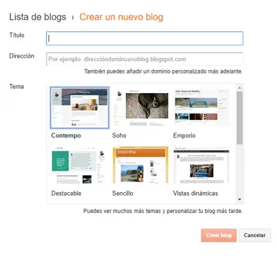 Remplissez les deux champs et choisissez parmi tous les thèmes disponibles. Gardez à l’esprit que le champ d’adresse doit être unique et qu’en plus, il aura l’ajout ou l’extension «blogspot.com», par exemple, www.miblogpersonal.blogspot.com.