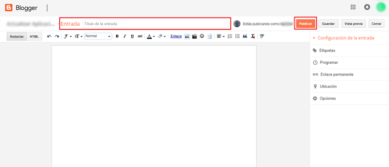 Une fois l’étape précédente terminée, vous vous retrouverez devant un document vide. C’est le corps du texte avec lequel vous remplirez le premier article de votre blog.Écrivez autant que vous le souhaitez et rappelez-vous que vous pouvez donner différents formats aux caractères, saisir des images, des vidéos, des émoticônes, ajuster l’alignement, utiliser des listes et même insérer des guillemets à l’aide des boutons disponibles sur la barre d’outils. Si vous préférez, vous pouvez même cliquer sur «HTML» pour modifier à l’aide du code Web.