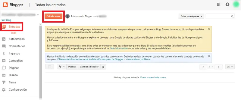 Entrez sur le site Web de Blogger comme nous l’avons indiqué précédemment et, une fois à l’intérieur, cliquez sur «Connexion» pour choisir votre compte et entrez le mot de passe pour accéder à votre panneau. Si votre compte est déjà associé, vous accéderez directement à votre panneau utilisateur dans Blogger au moment où vous saisissez l’URL dans la barre d’adresse.