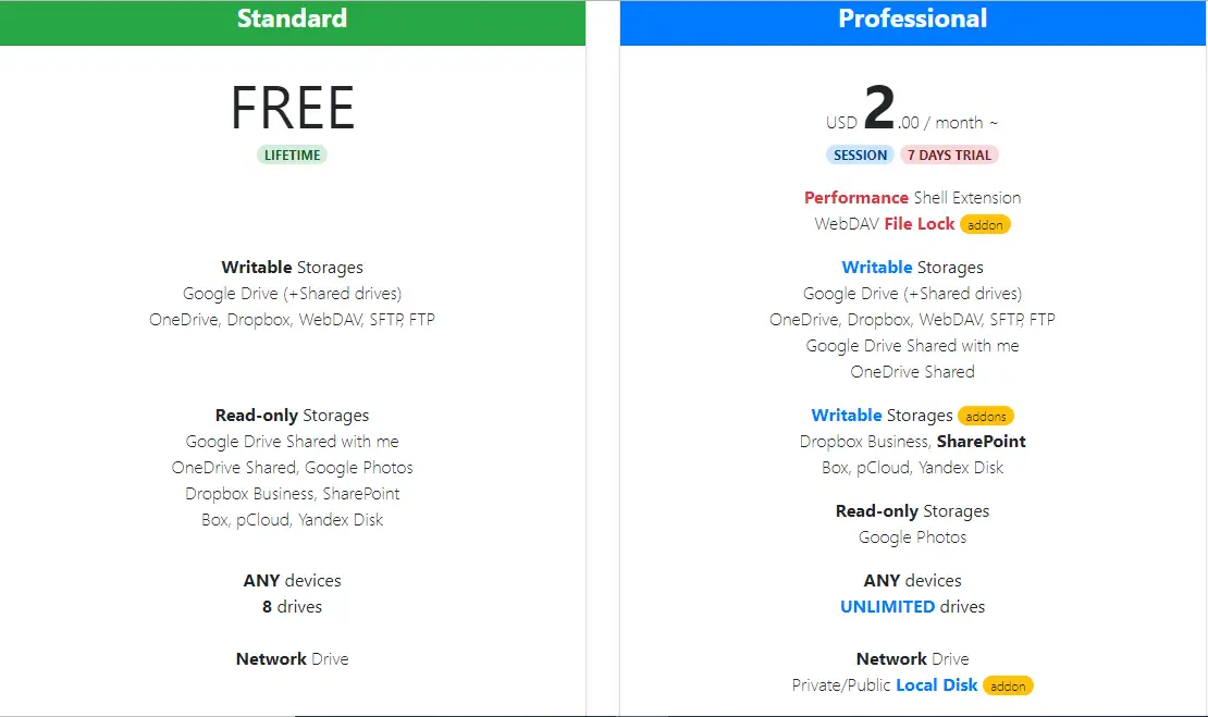 RaiDrive est un programme gratuit pour les principales fonctionnalités, mais il existe une version payante qui étend les fonctionnalités. Ce programme nous permettra de créer des disques durs virtuels sur notre ordinateur, dans le but d’avoir toujours à disposition comme s’il s’agissait d’un autre disque dur, tout ce que le service de stockage en nuage a. Ce gestionnaire de stockage Cloud prend en charge les services suivants :