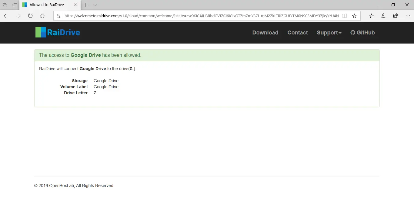 Une nouvelle fenêtre apparaîtra dans le navigateur Web où elle nous accueille sur RaiDrive et confirme que dans ce cas nous avons monté une unité Google Drive, avec le nom Google Drive et avec la lettre de lecteur Z. Elle s’ouvrira dans notre explorateur À partir de Windows le lecteur créé dans des emplacements réseau, avec le logo RaiDrive et le nom et la lettre du lecteur attribués précédemment, comme vous pouvez le voir ici :