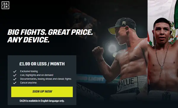Bien que son objectif principal soit la diffusion de boxe en qualité HD, il s’agit d’un autre des sites Internet qui vous permet de visualiser des événements sportifs dans d’autres ligues, telles que la NFL et la NBA. Désormais, DAZN est une page de paiement, donc, pour profiter du contenu susmentionné, vous devez vous abonner à sa plateforme . Ce qui est un processus rapide et facile, dans lequel vous devez fournir certaines informations personnelles, telles que nom, prénom, e-mail, etc.