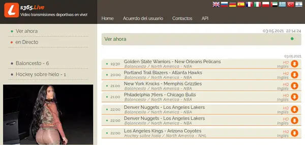 Anciennement appelé Sport 365 Live , ce site internet vous permet de regarder des événements sportifs en direct depuis l’écran de votre ordinateur ou Smartphone. Il est considéré comme l’un des meilleurs sites sur Internet pour profiter du beau jeu, cependant, il étend également sa liste de possibilités à d’autres sports , comme le basket-ball. Il convient de mentionner que l’un des meilleurs avantages de ce site est que vous pouvez visualiser autant de jeux que vous le souhaitez, sans avoir à créer de compte .