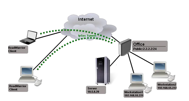 Dans le schéma ci-dessous, on peut voir que les clients «Roadwarrior» se connectent à Internet et établissent un tunnel vers le «bureau», qui dispose d’un serveur VPN. Dans ce type de schéma, nous pouvons tunneler tout le trafic de l’origine à la destination pour accéder à Internet via la connexion Internet du serveur, ou uniquement tunneler le trafic pour accéder au réseau privé local. Dans le cas des VPN commerciaux, ils permettent les deux choses facilement et rapidement, de cette façon, nous ne pouvons faire passer que le trafic que nous voulons via le VPN, et le reste du trafic via notre connexion Internet.