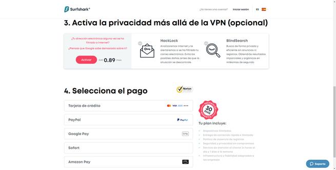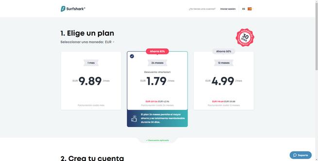 Si nous allons sur le site officiel de Surfshark , nous pouvons voir que le prix mensuel est de 1,79 € si nous achetons l’abonnement pour 2 ans, un prix vraiment compétitif. Nous devons garder à l’esprit que ce VPN répond à toutes les exigences que nous avons expliquées précédemment, c’est donc l’un des meilleurs que nous puissions trouver aujourd’hui.