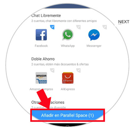 - Toutes les applications installées sur votre ordinateur apparaîtront dans une liste où vous devrez sélectionner celles que vous souhaitez cloner avec Parallel Space. Pour ce faire, sélectionnez «Ajouter dans un espaceur parallèle».