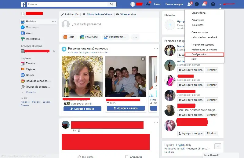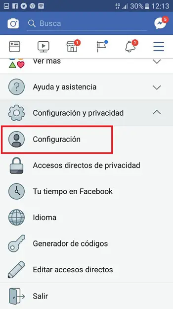 - Entrez et connectez-vous à Facebook comme vous le faites normalement, dans le coin supérieur droit où vous voyez les notifications et votre profil, recherchez la dernière icône et cliquez dessus, parmi les options de menu choisissez « Paramètres» .