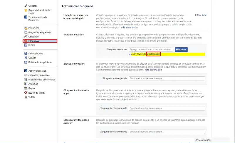 - Dans les paramètres, recherchez la section » Verrous » sur la gauche. Lorsque vous chargez, vous verrez différentes options parmi lesquelles » Bloquer les utilisateurs «, vous pouvez ajouter cette action à l’un de vos contacts simplement en entrant son nom, de la même manière ci-dessous se trouve une liste de ceux qui sont bloqués, à côté de leur nom, vous trouverez le mot Déverrouiller, si vous voulez le faire, cliquez sur .