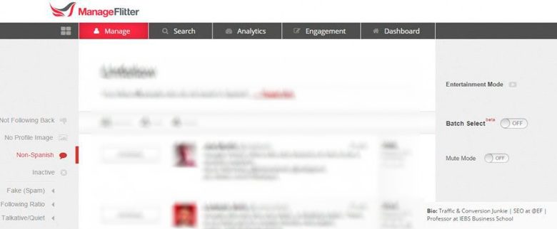 C’est un autre avantage que vous obtiendrez avec cet outil d’analyse de masse pour Twitter . En effet, Manage Flitter dispose d’un grand nombre de filtres qui vous permettent de différencier précisément le type d’utilisateur qui vous intéresse . De cette façon, vous pouvez éviter les personnes qui parlent dans une autre langue, les utilisateurs inactifs et les comptes qui effectuent du spam, entre autres filtres.