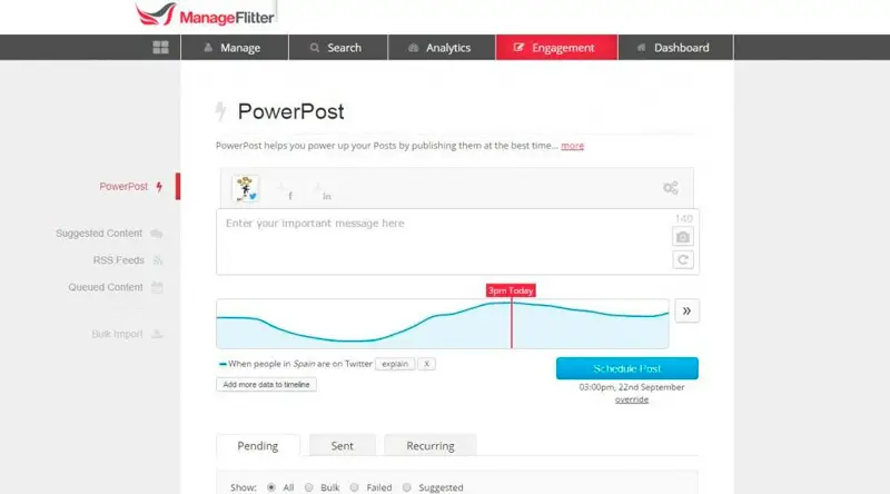 Vous pouvez également bénéficier de la publication de tweets pendant les heures les plus chargées de votre audience . Pour cette raison, il vous faudra garder à l’esprit l’étude du comportement de vos followers et utiliser fréquemment cette fonction que Manage Flitter vous propose .