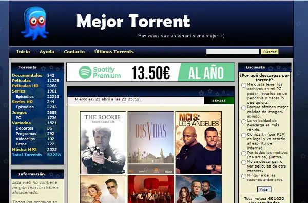 En raison du grand nombre d’attaques que reçoivent ces types de pages, EliteTorrent change constamment de domaine pour assurer une bonne présence sur Internet. C’est l’une des plates-formes les plus anciennes et propose une grande variété de catégories dans lesquelles vous pouvez choisir des films ou des séries de drame, d’action, de comédie, d’horreur, entre autres.