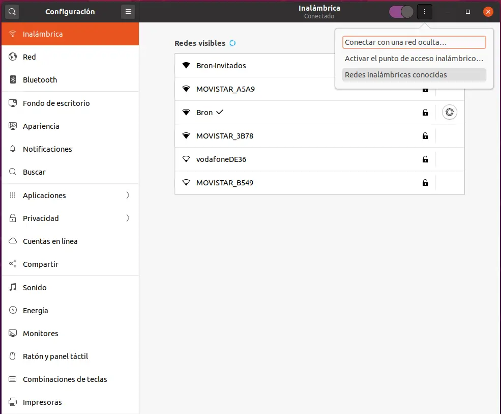 Une fois que nous sommes dans ce menu, nous allons dans la section » Sans fil «, en haut à droite, dans le menu avec trois points verticaux, nous cliquons sur » Réseaux sans fil connus » pour obtenir toute la liste.