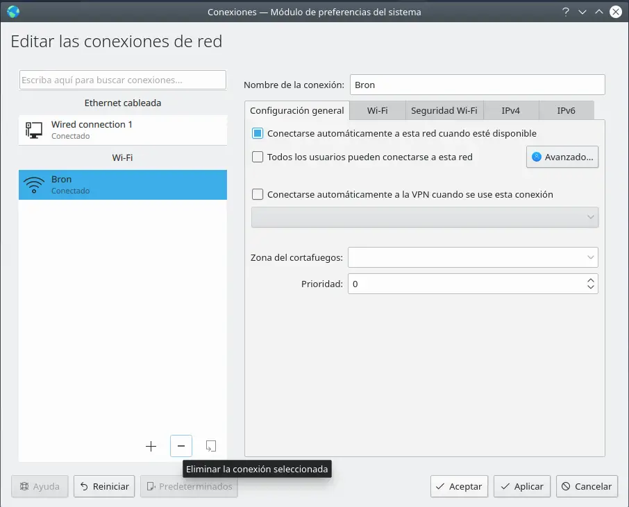 Une fois que nous sommes entrés dans » Configurer les connexions réseau «, nous choisissons le réseau Wi-Fi que nous voulons supprimer, et appuyez sur le bouton » – « qui apparaît juste en dessous et indique » Supprimer la connexion sélectionnée «.