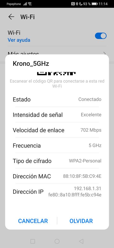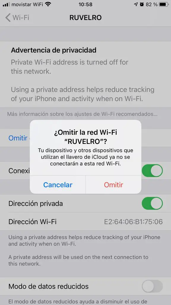 Dans le menu Wi-Fi, nous verrons les réseaux Wi-Fi auxquels nous pouvons nous connecter, ainsi que le réseau Wi-Fi auquel nous sommes actuellement connectés. Si nous voulons supprimer le réseau Wi-Fi auquel nous sommes connectés maintenant, pour nous reconnecter plus tard ou l’oublier pour toujours, nous devons cliquer dessus et cliquer sur » Ignorer ce réseau» :