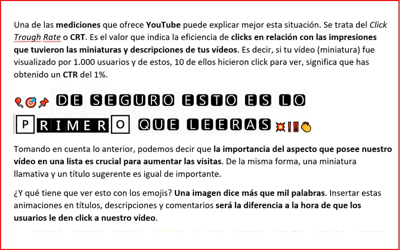 Compte tenu de ce qui précède, nous pouvons dire que l’importance de l’aspect de notre vidéo dans une liste est cruciale pour augmenter les visites . De la même manière, une vignette frappante et un titre suggestif sont tout aussi importants. Et qu’est-ce que cela a à voir avec les emojis? Une image en dit plus que mille mots . L’insertion de ces animations dans les titres, descriptions et commentaires fera la différence lorsque les utilisateurs cliquent sur notre vidéo .