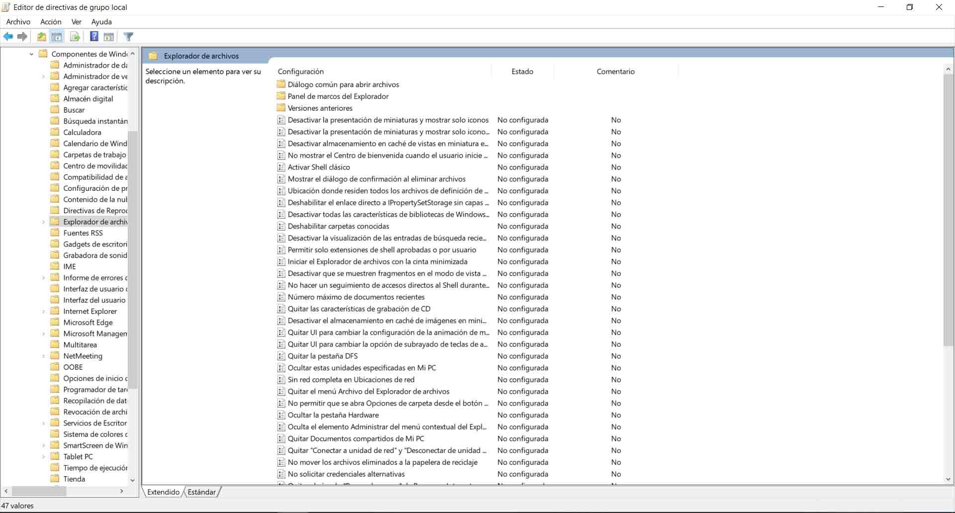 Pour ce faire, la première étape consiste à entrer dans l’ éditeur de stratégie de groupe . Nous devons appuyer sur la combinaison de touches Windows + R et exécuter gpedit.msc. Une fois ici, nous devons cliquer sur Configuration utilisateur, nous allons dans Modèles d’administration, Composants Windows et Explorateur de fichiers.
