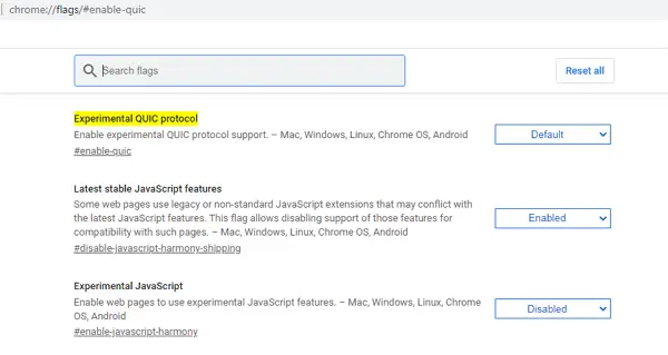 Pour résoudre ce problème, allez dans le chemin chrome : // flags / # enable-quic depuis la barre d’adresse du navigateur et désactivez le protocole en question.