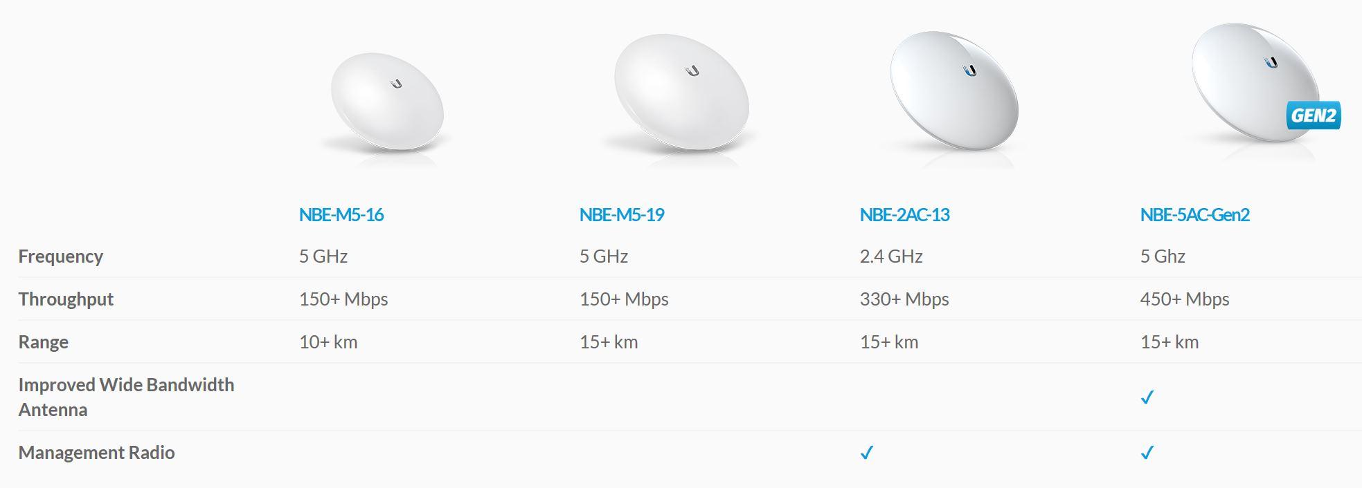 Ces antennes sont similaires aux précédentes, mais elles nous permettent d’avoir une excellente qualité de liaison lorsque nous avons beaucoup d’interférences externes. Nous avons actuellement différents équipements dans cette famille, tous deux fonctionnant dans la bande 2,4 GHz et également en 5 GHz. En fonction de la distance à laquelle on fait le lien, il conviendra de choisir l’un ou l’autre modèle, vous pourrez alors les voir tous :