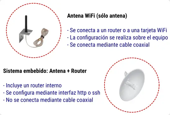 Une autre classification que nous pourrions faire se situe entre une simple antenne WiFi et une antenne avec un système d’exploitation intégré. Certains des équipements que nous pouvons trouver aujourd’hui ne sont pas une simple antenne, ils ont autre chose à l’intérieur. Dans ce cas, nous allons différencier deux types :