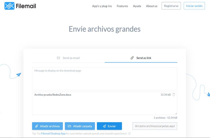 L’utilisation de Filemail est très simple. La première étape consiste à entrer votre site Web . Nous y trouverons les différentes options que nous avons à notre disposition. Nous verrons rapidement qu’un bouton apparaît pour télécharger des fichiers ou des dossiers. Il convient de mentionner que nous pouvons les envoyer à la fois à une adresse e-mail et obtenir simplement le lien et pouvoir les partager par d’autres moyens.