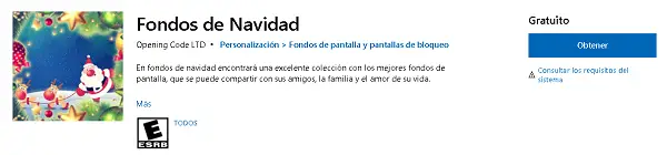 C’est une autre application du Microsoft Store entièrement gratuite dans laquelle vous pouvez obtenir divers fonds d’écran de Noël pour PC en HD. Cela fonctionne de la même manière que l’application précédente, il vous suffit donc d’entrer dans le Microsoft Store, d’écrire son nom et d’appuyer sur le bouton » Obtenir » . Vous pouvez également le télécharger directement via celien .
