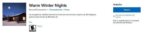 C’est l’une des applications du Microsoft Store. AuWarm Winter Nights, vous trouverez un ensemble de 18 images de cabanes de Noël. L’application est entièrement gratuite et il vous suffit d’appuyer sur le bouton » Obtenir » pour lancer le téléchargement des images, qui ne peuvent être utilisées que comme fond d’écran pour le bureau de l’écran.