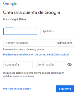 - Pour créer le compte d’accès Drive, remplissez le formulaire affiché à l’écran, il vous demandera des données élémentaires telles que Nom, Prénom et Date de naissance. En plus de cela, il demandera la saisie d’un mot de passe et d’un nom de courrier électronique.