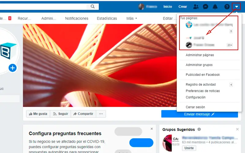 - Ensuite, si vous êtes sur votre profil Facebook personnel , cliquez sur le menu en haut à droite et dans la section «Vos pages» choisissez le compte correspondant.