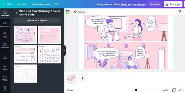 Canva est l’une des plateformes les plus populaires destinées aux fans de design graphique , qui a la possibilité de créer des bandes dessinées dans lesquelles vous aurez à votre disposition un large catalogue de modèles, textes, éléments, autocollants et images pour créer des bandes dessinées uniques et les personnaliser votre chemin.