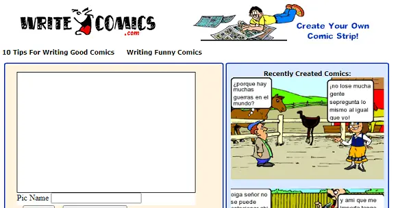 Write Comics a une interface un peu obsolète , mais il dispose d’un excellent éditeur qui se trouve sur sa page d’accueil, où vous trouverez une série d’outils de travail qui vous seront utiles lors de la création de votre propre bande dessinée, notamment des options pour ajouter des objets, des bulles de dialogue, scènes, et les gens. De plus, il s’agit d’un site Web où vous n’aurez pas besoin de vous inscrire .