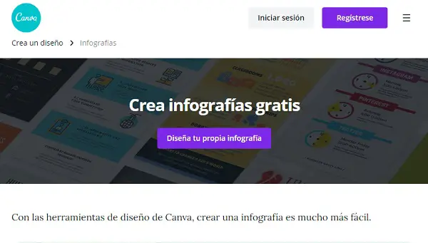 Pour commencer à utiliser ce site Web, vous devez vous inscrire avec un compte Google, Facebook ou votre e-mail. De cette façon, vous enregistrerez les designs que vous avez créés et vous pourrez les télécharger autant de fois que nécessaire. Pour accéder à Canva, il vous suffit de cliquer sur ce lien : https://www.canva.com/es_es/crear/infografias/