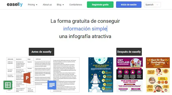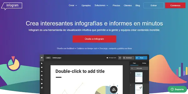 Son interface est assez simple, attrayante et est en espagnol . Il est facultatif d’acquérir un abonnement payant, bien que sa version gratuite propose également une grande variété de modèles et de diagrammes que vous personnaliserez à votre guise. Vous pouvez exporter vos conceptions directement sur votre site Web, votre blog ou votre réseau social. Pour accéder à Infogram, cliquez sur le lien suivant : https://infogram.com/es/