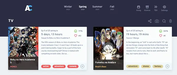 AniChart est une page qui se démarque par une interface innovante, attrayante et saisissante , où vous trouverez du contenu anime gratuitement et de haute qualité . De plus, vous n’avez pas besoin de compte pour profiter de vos films ou séries d’anime préférés, vous pouvez donc visionner les titres que vous souhaitez avec un doublage exceptionnel . Vous disposez également d’un chat pour communiquer avec les autres utilisateurs de cette communauté.