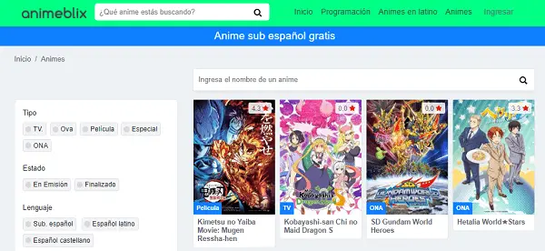 Monoschinos est une page que vous pouvez utiliser pour regarder des animes gratuits en ligne. C’est une excellente option car il reçoit des mises à jour fréquentes , de sorte que vous pourrez regarder sans problème des animes diffusés avec des sous-titres espagnols. De plus, la plateforme n’a pas besoin d’inscription , bien qu’elle présente de petits segments publicitaires avant de jouer la série animée de votre choix.