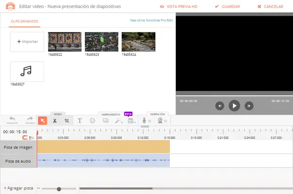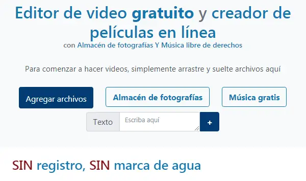 Pour utiliser cette plate-forme, vous devez avoir un compte ou vous inscrire , ce qui n’a aucun coût. Il s’agit d’une page gratuite avec laquelle vous pouvez télécharger vos vidéos et les éditer avec divers outils d’édition de base tels que l’écrêtage, la saturation, la luminosité et le contrôle des couleurs, entre autres. Il vous permettra également d’ insérer des sons, des images supplémentaires ou de la musique et de les ajuster lors de l’édition.