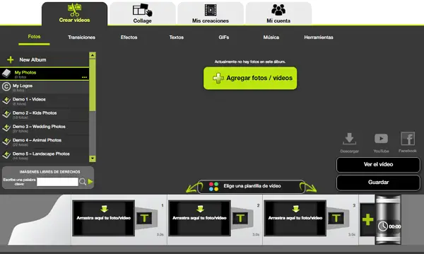Il s’agit d’un site web conçu pour créer des vidéos amusantes à partager sur les réseaux sociaux . L’idée principale de son fonctionnement est de combiner différentes images, photos et vidéos pour en faire un assemblage final très divertissant. La version gratuite de Kizoa ne vous offre qu’un espace maximum de 1 Go , de plus les fichiers seront filigranés. D’autre part, vous pouvez utiliser de nombreuses fonctions telles que l’ajout de texte et d’effets , entre autres.