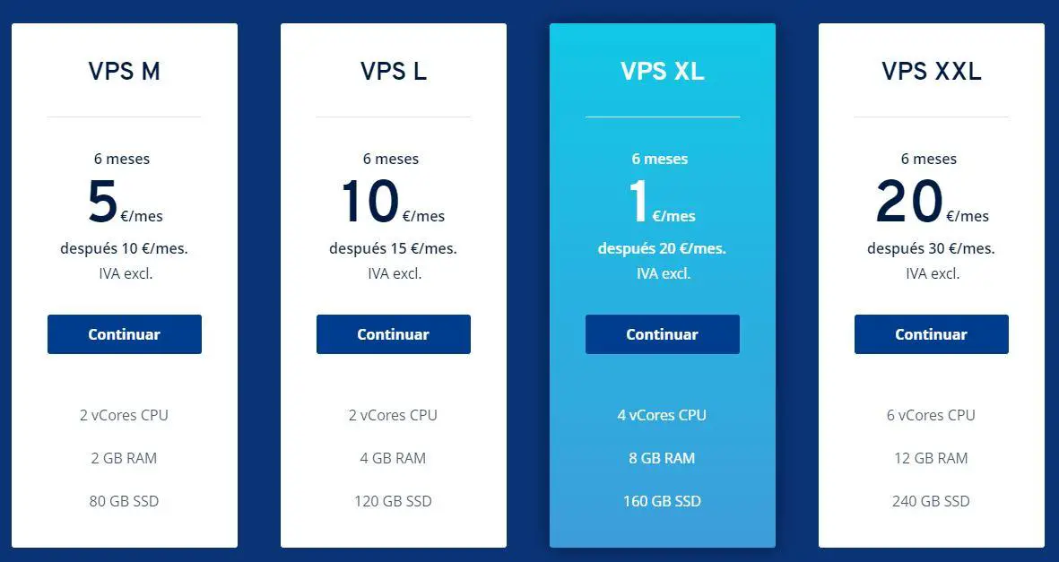 Dans les forfaits que Ionos nous propose, on peut trouver des serveurs VPS à partir de 5 euros (les 6 premiers mois) qui nous offrent 2 vCores, 2 Go de RAM et 80 Go de stockage SSD. Si nous avons besoin de plus de puissance, nous pouvons choisir l’une des autres modalités pour configurer notre site Web sur notre serveur privé.
