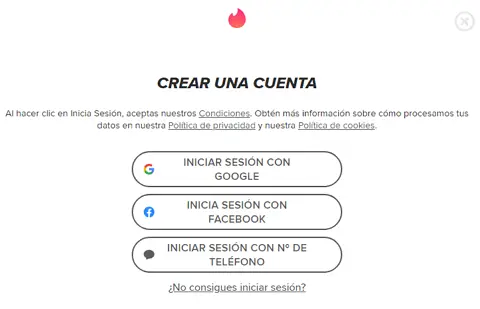 - Choisissez si vous décidez de créer le compte avec votre profil Facebook, Google ou votre numéro de téléphone . Si vous commencez avec votre compte Facebook ou Google, vous devez le saisir. Si vous le faites avec votre numéro de téléphone, vous devrez le saisir, attendre un code de vérification à 6 chiffres et ajouter en plus votre e-mail pour le confirmer.