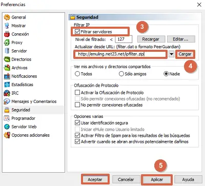 - Entrer http://emling.net23.net/ipfilter.zip ouhttp://sites.google.com/site/ircemulespanish/descargas-2/ipfilter.zip . Avec cela, vous pourrez filtrer les serveurs malveillants. Appuyez sur « Charger «,