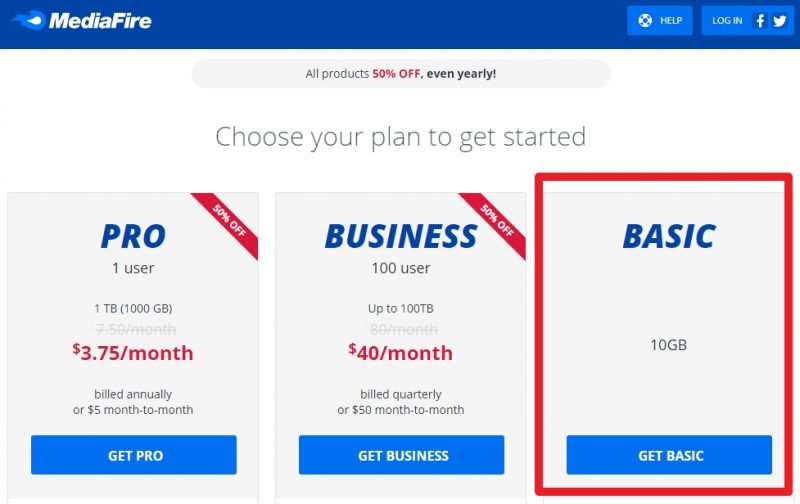 - Ensuite, vous verrez les différents plans proposés par MediaFire. Pour créer un compte gratuit avec 10 Go de stockage, choisissez Get Basic .