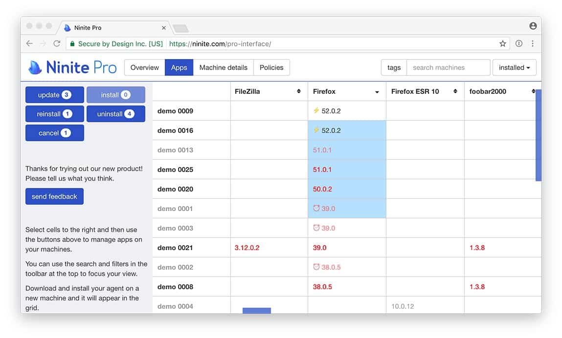 L’interface utilisateur de Ninite Pro est assez différente de la plupart des autres produits. Présente les ordinateurs gérés sous forme de tableau: une ligne pour chaque ordinateur, une colonne pour chaque application. Cela ressemble à une feuille de calcul dans laquelle chaque cellule montre quelle version du logiciel est actuellement installée. À partir de cette interface facile à utiliser, vous pouvez choisir d’installer, de désinstaller ou de mettre à jour le logiciel correspondant sur n’importe quel ordinateur.