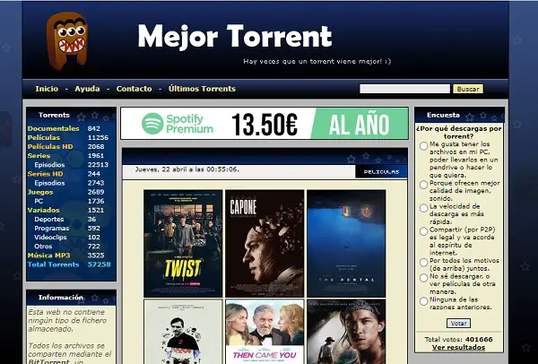 Une autre caractéristique remarquable est qu’il possède plus de 2 000 torrents sur le Web , il dispose donc d’un vaste catalogue mis à jour en fonction des premières qui sont apparues sur les panneaux d’affichage des films. De la même manière, il dispose d’un support d’aide au cas où vous auriez besoin d’une réponse à vos questions. Si vous souhaitez utiliser ce portail, il vous suffit d’appuyer sur ce lien ( https://mitorrent.org )