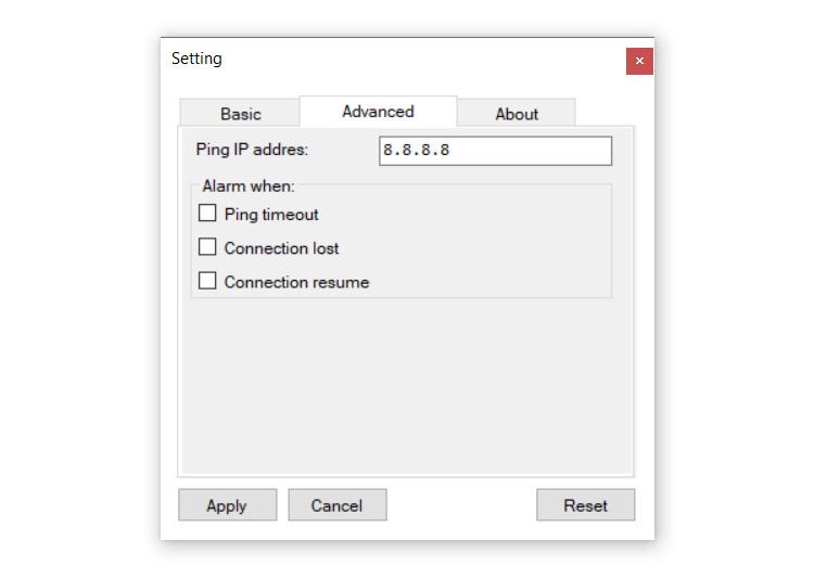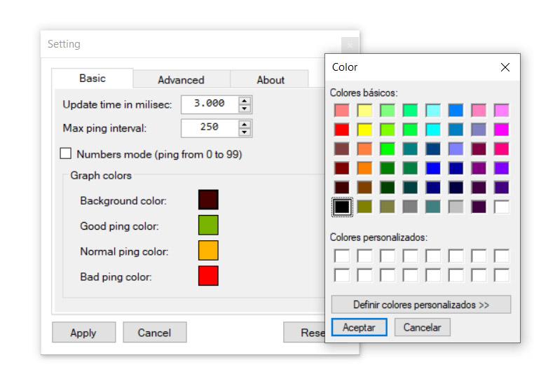 Dans la configuration de base, nous pouvons modifier certains aspects tels que le temps qui s’écoule pour demander le ping, les couleurs ou l’intervalle maximum. Si nous entrons dans la section Avancé, nous pouvons trouver d’autres options, telles que l’adresse IP à laquelle nous pingons (par défaut, Google DNS vient), ainsi que configurer une alerte lorsque, par exemple, la connexion est perdue.