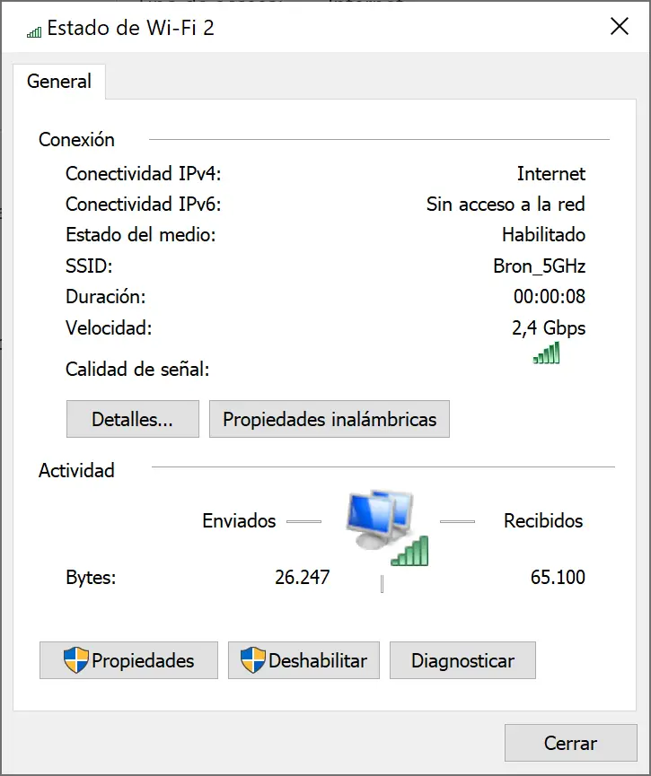 Lors de nos récents tests, nous avons réalisé des synchronisations avec le routeur 2,4 Gbit/s, c’est-à-dire la vitesse maximale que le Wi-Fi 6 nous permet avec 160 MHz de largeur de canal et 2 antennes internes :