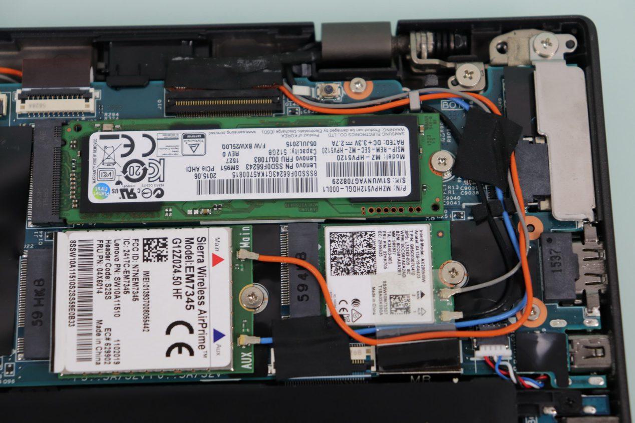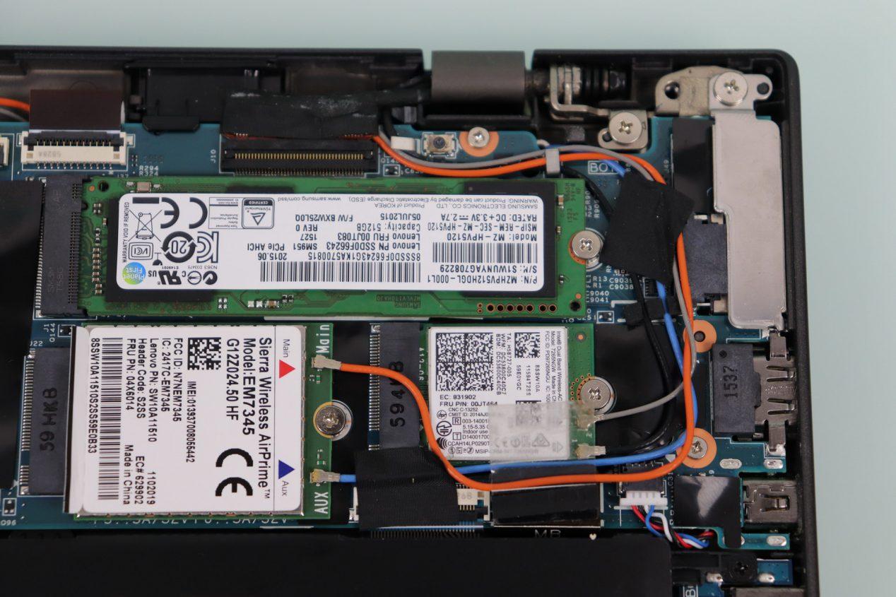 Lorsque nous enlevons le boîtier inférieur, nous pouvons voir qu’en haut à droite, nous trouvons le SSD de 512 Go, la carte 4G LTE que j’ai achetée en option avec l’ordinateur portable, et juste à droite, nous avons la carte Intel AC7265.