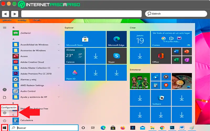 - Pour commencer, vous devez entrer dans le menu Démarrer de Windows 10 et y sélectionner l’icône «Paramètres» qui est une roue.