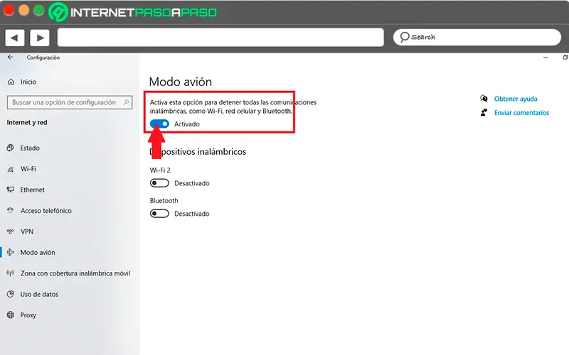 - Une fois que vous êtes dans la section «Mode avion» , une option apparaîtra où vous pouvez l’activer pour arrêter toutes les communications sans fil sur l’ordinateur. Pour activer cette fonction, tout ce que vous avez à faire est d’activer l’interrupteur qui y apparaît, de cette façon vous activerez cette fonction sur votre PC Windows 10 .