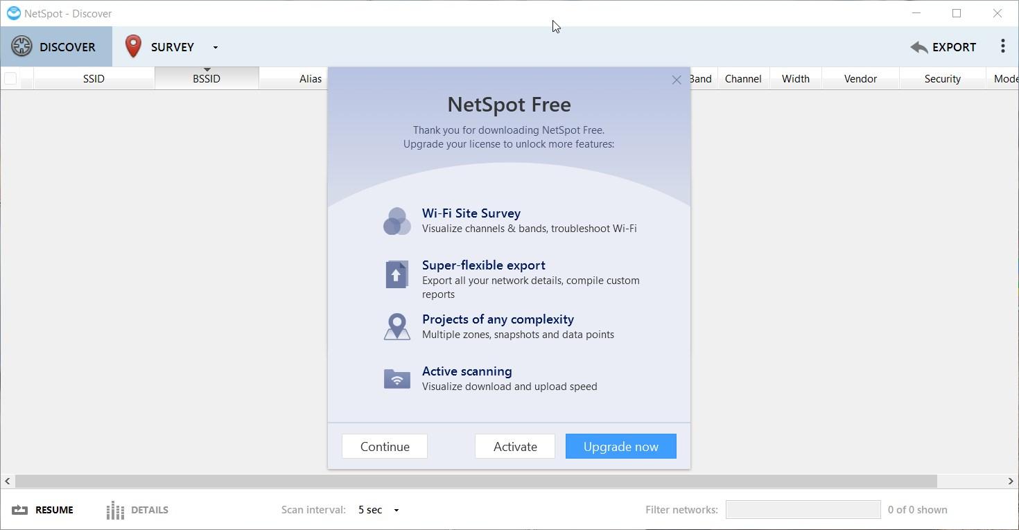 La première chose que nous allons voir dans NetSpot sont les caractéristiques de la version NetSpot PRO, qui nous permettront de visualiser beaucoup plus d’informations sur nous, d’exporter les informations collectées, de créer des projets avec des cartes thermiques et même de permettre une analyse active où nous visualisera la vitesse de téléchargement et de téléchargement.