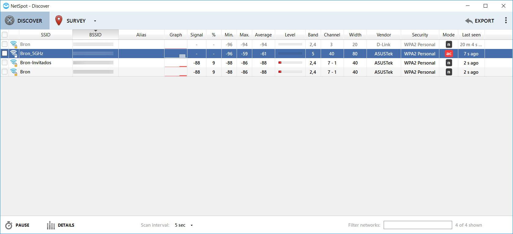 NetSpot dispose d’un « mode découverte », dont l’objectif est de visualiser tous les détails des réseaux Wi-Fi qui nous entourent, en présentant les données sous forme de tableau interactif. Toutes les données que nous recevons sont en temps réel, si de nouveaux réseaux Wi-Fi apparaissent, ces changements seront également reflétés dans le programme. Nous pourrons voir la configuration individuelle de chacun des points d’accès, des graphiques en temps réel, et il est même compatible avec les bandes 2,4 GHz et 5 GHz simultanément (il est obligatoire d’avoir une carte Wi-Fi double bande, sinon c’est non nous verrons 5GHz). Nous pourrons également comparer facilement les différents points d’accès en termes de signal reçu, et même exporter les informations au format CSV pour une analyse ultérieure.